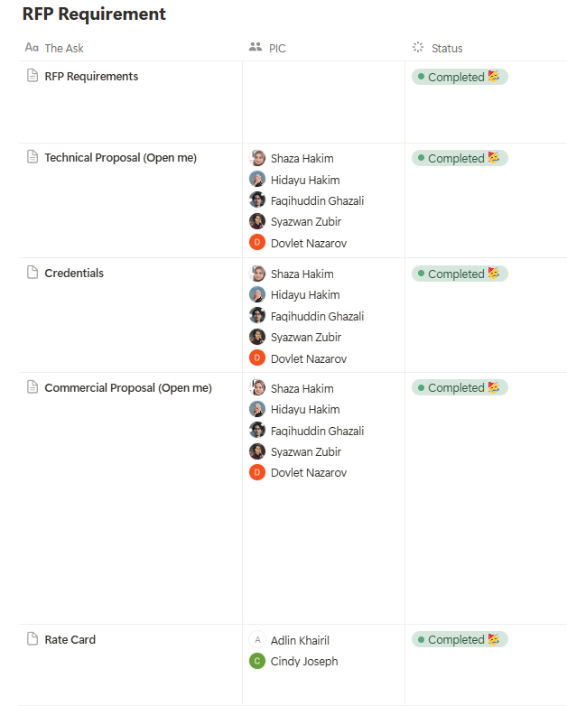 Once the client replies, the real groundwork begins. My role in Ops is a bit like being the PM of a project. I’ve experimented with many PM tools for tracking proposal tasks, but for me, Notion is home base. It’s where we collect every piece of information so everyone has access to the same page.